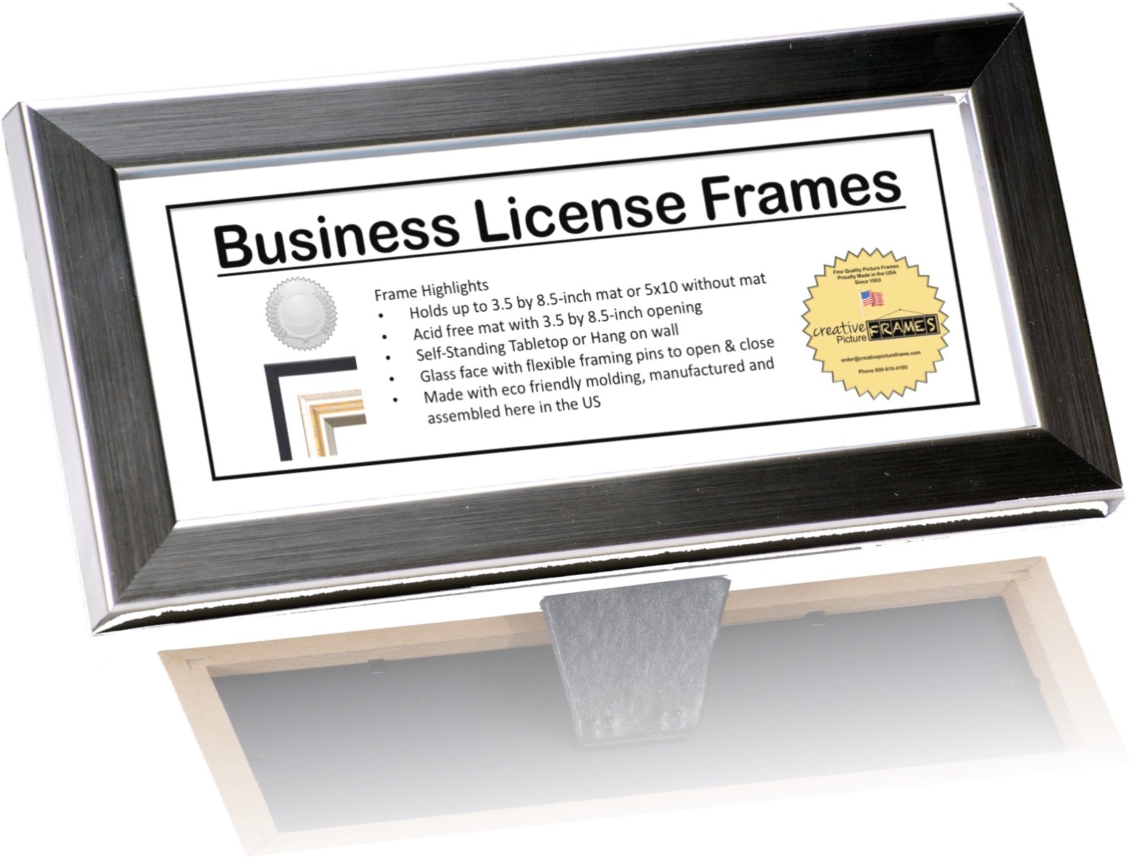 The 3.5x8.5 License Frame with Mat enhances the detail of your media with the use of a bold white or black mat. This frame will transform how you display your business licenses, DEA licenses, cosmetology certificates, or any other 3.5x8.5-inch media.